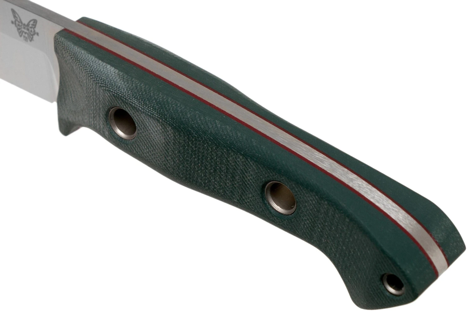 Le Benchmade Bushcrafter 162, comme son nom l’indique, un couteau fixe destiné au bushcraft. Le manche a un profil particulier offrant une prise en main très confortable. Le manche est en G10 vert avec un backspacer vulcanisé rouge. Le tout est maintenu ensemble par des anneaux en titane. Une construction particulière et efficace, car elle permet d’attacher le couteau par exemple. On peut l’utiliser comme lance improvisée. La lame en acier poudré S30V a une construction full tang ce qui la rend relativement lourde. Ce couteau est donc parfaitement adapté à une utilisation intensive.