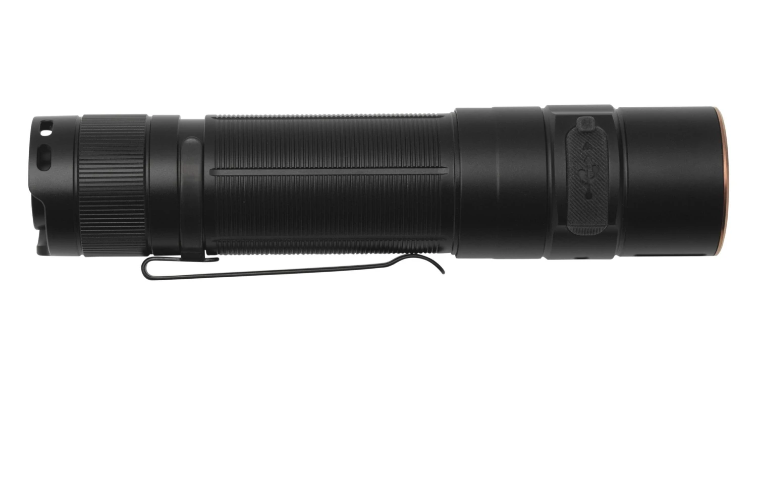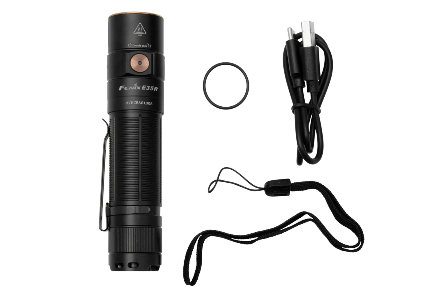 La lampe de poche Fenix E35R EDC est la version amĂ©liorĂ©e du modèle prĂ©cĂ©dent : l’E35 V3.0. Cette nouvelle lampe dispose de 100 lumens supplĂ©mentaires, soit 3100 lumens en tout, et une portĂ©e de pas moins de 260 mètres. Cette lampe a un faisceau puissant et large. IdĂ©al pour la randonnĂ©e, le camping ou, bien sĂ»r, pour utiliser Ă la maison. Elle est agrĂ©ablement compacte et lĂ©gère ; vous pouvez donc l’emporter facilement avec vous. Elle fonctionne avec une batterie rechargeable Li-ion 21700 5000 mAh. Cette dernière est incluse. Vous pouvez facilement charger cette batterie avec le câble de charge USB-C inclus. En comptant la batterie, cette lampe pèse 150 grammes.