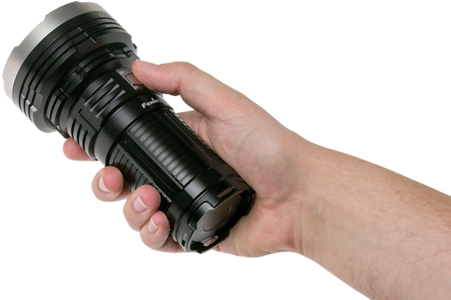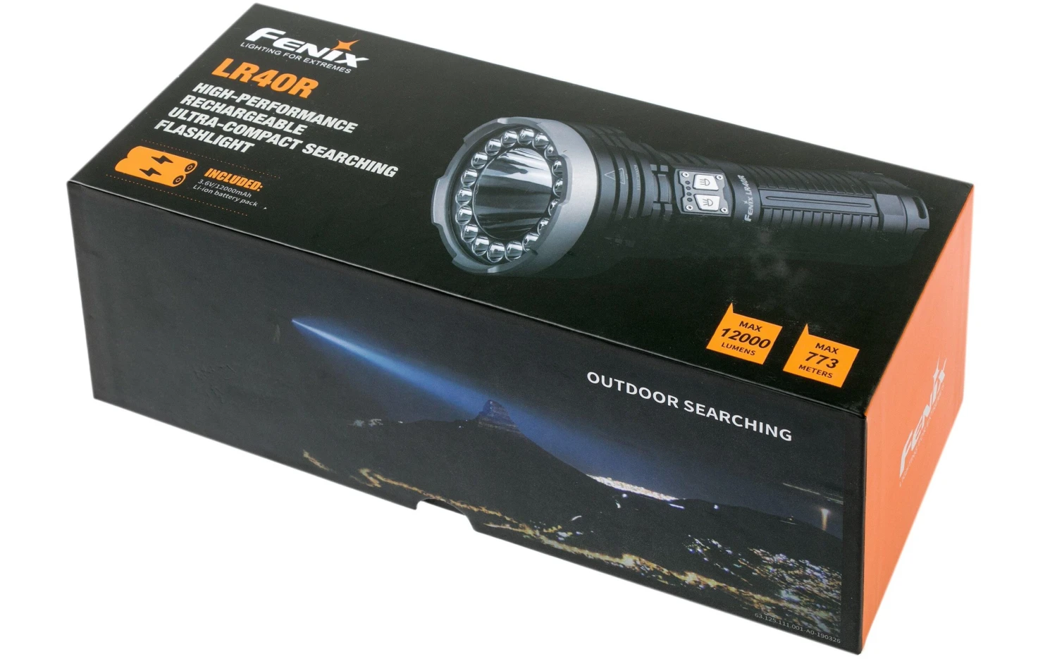 La lampe de poche LED Fenix LR40R est extrêmement puissante. Le large faisceau se combine avec la fonction spotlight (faisceau concentré) pour obtenir une puissance lumineuse allant jusqu’à 12 000 lumens et une portée lumineuse de 773 mètres. En résulte un énorme faisceau qui, combiné à sa taille compacte, rend cette lampe de poche idéale pour les recherches, les sauvetages, la spéléologie et toutes autres activités de plein air.