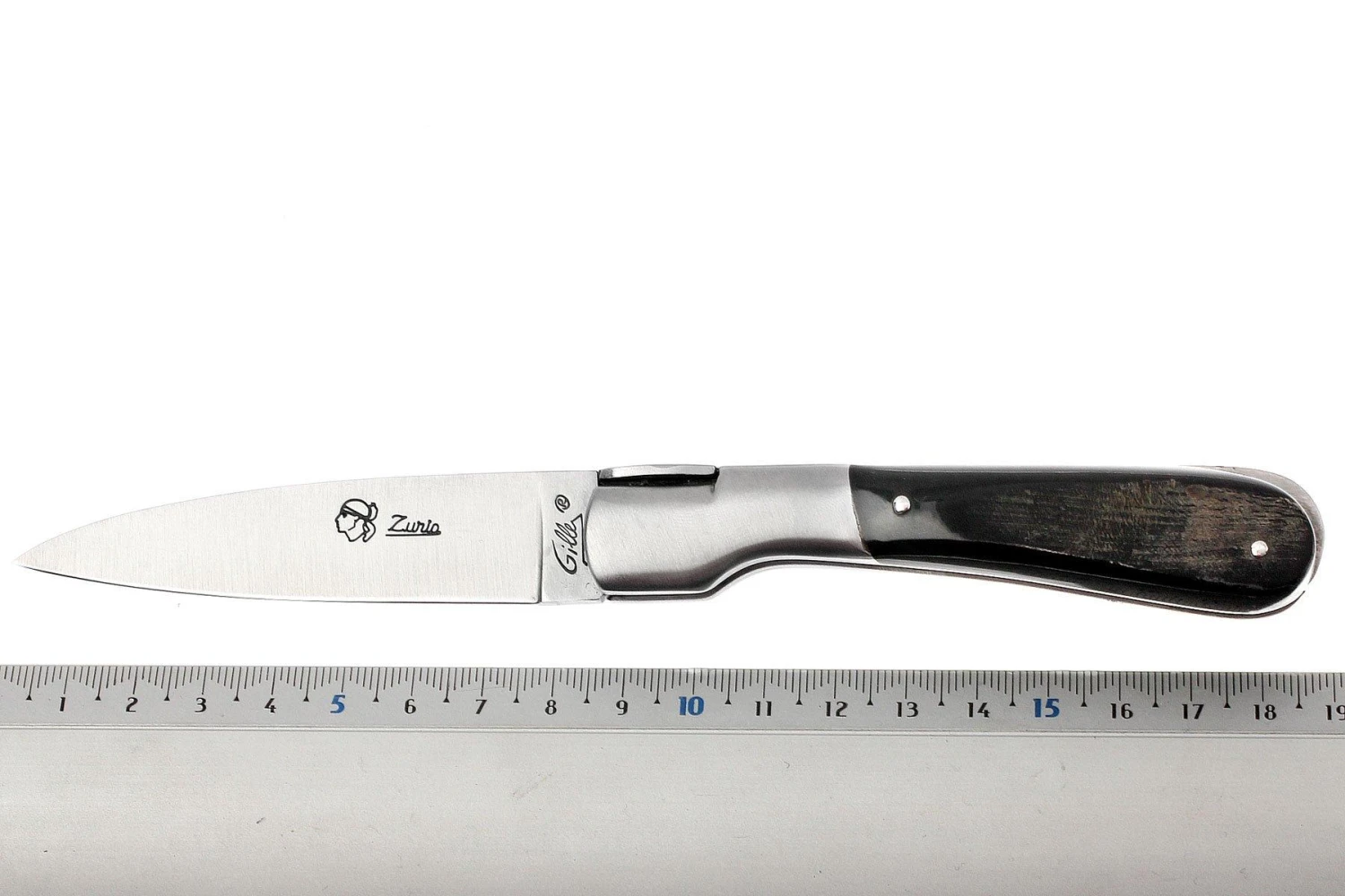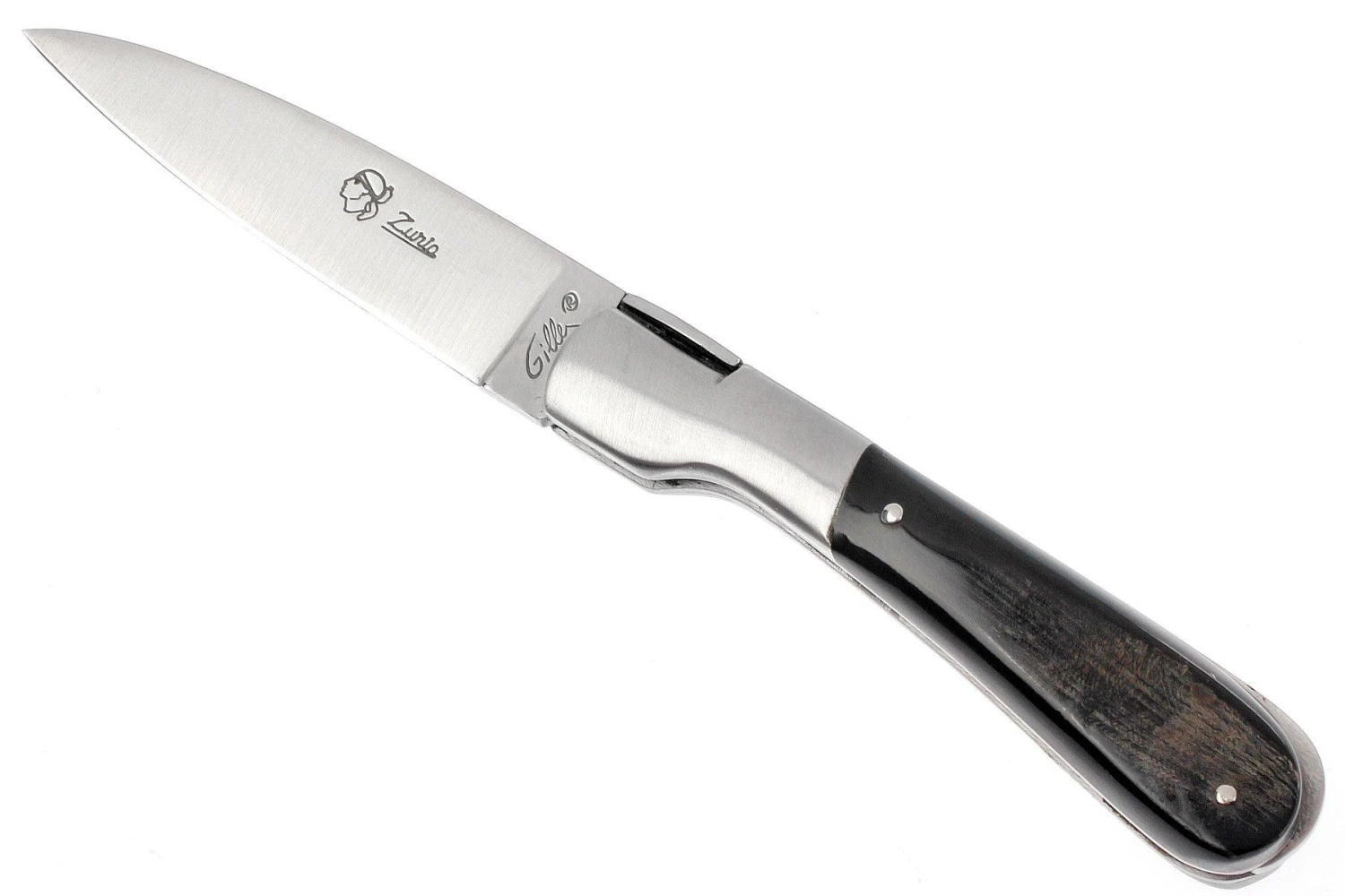 Couteau de poche Laguiole classique français, fait à la main. Longueur fermé : 10,5 cm. Lame en acier 12c27 avec un mécanisme de verrouillage à pompe arrière (back-lock). Manche en corne de buffle.