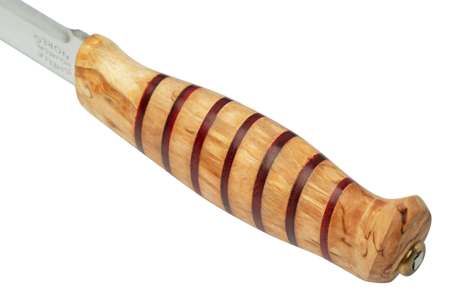 Le Helle JS Limited Edition 2022 est un superbe couteau, conçu par Jan Steffen Helle. Il s’agit du petit fils de Sigmund Helle, l’un des créateurs de la marque. Et vu qu’il y a 90 ans, les frères Sigmund en Steinar construisaient leur propre forge, leurs petits-fils ont voulu rendre hommage aux designs de leurs grands-parents. Le Helle JS est aussi inspiré de la toute première collection haut de gamme de Helle : la collection Fjellkniven Le JS est donc doté de la gravure originelle norvégienne, avec la marque et les initiales du fabriquant. L’inscription JS, sur la lame, signifie Jan Steffen. Le fourreau en cuir inclus est également similaire aux fourreaux d’autrefois. Avec un magnifique motif norvégien.
