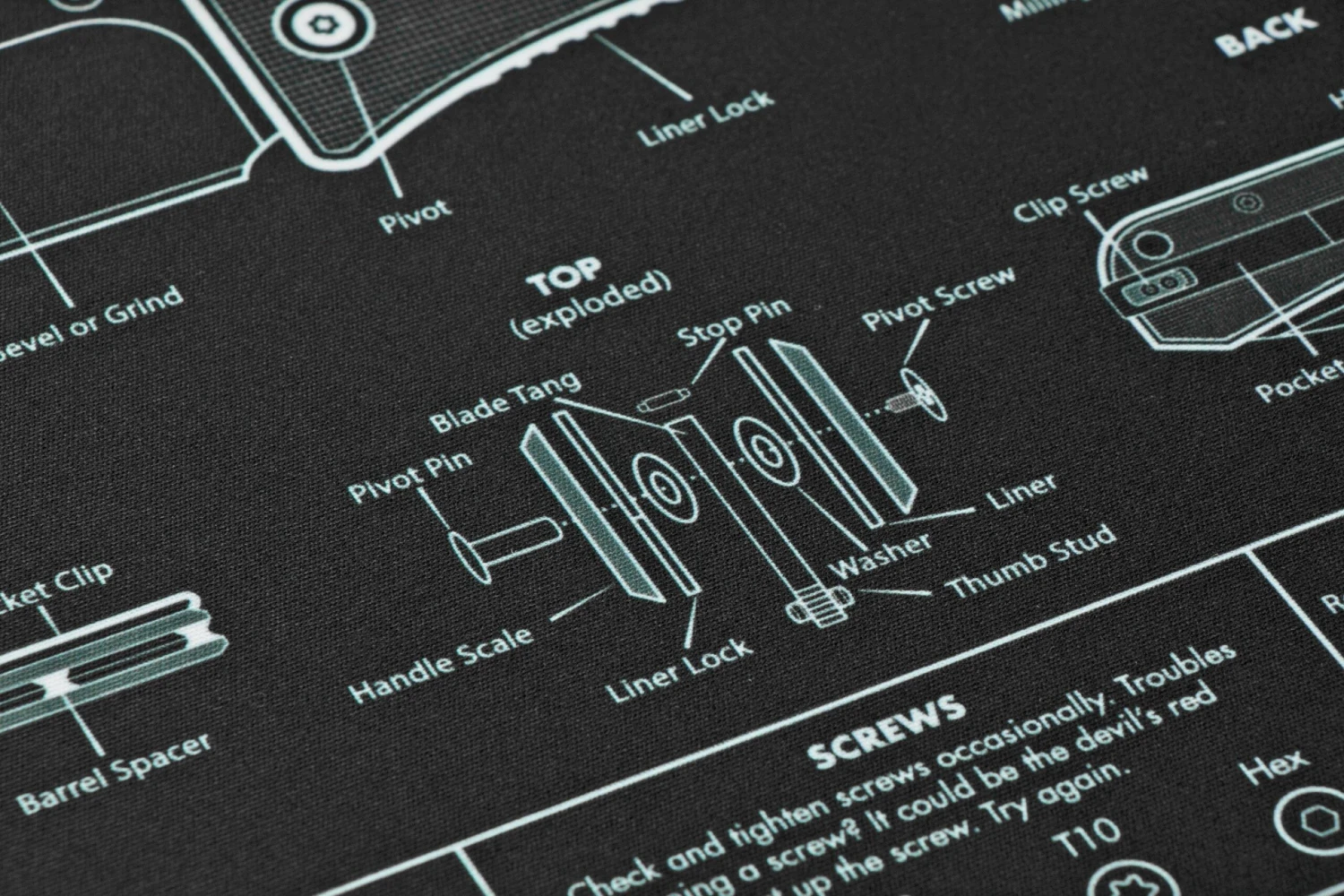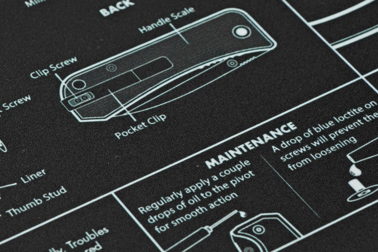 Ce tapis de souris Knafs Knife Mouse Pad est un super tapis pour présenter vos couteaux (ou tapis de souris) avec des informations sur les couteaux. Anatomie d’un couteau, formes de lames, et même une règle en centimètres et en pouces sur le côté. Le dessus est en polyester doux, et le dessous est fait d’une couche antidérapante. Pour un tapis de souris, il est assez gros, et on peut aussi s’en servir pour présenter ou bricoler ses couteaux. Vous avez immédiatement toutes les infos sous les yeux.