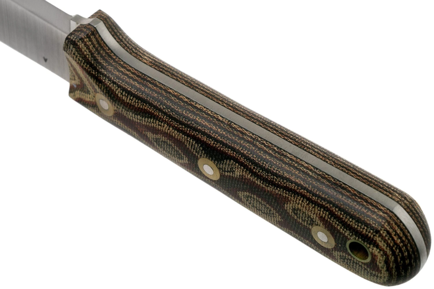 Le LT Wright Genesis Scandi est un couteau de bushcraft cool et populaire, fabriqué aux États-Unis. Au niveau des formes, c’est un peu l’archétype du couteau bushcraft : simple mais efficace. Le manche a l’air simple, et il l’est. Parce qu’il fonctionne simplement. Sur ce manche « broomstick » (manche à balai), vous avez une excellente adhérence dans toutes les différentes prises de bushcraft. Que vous fassiez des entailles, des feathersticks ou la cuisine. Les évidements profonds à l’avant du manche sur le côté sont prévus pour votre pouce. Idéal lors d’un mouvement de tranchage « chest-lever », ou lors de l’éviscération du gibier. Ainsi, vous êtes toujours sûr à 100% de la façon dont vous tenez le couteau. Même dans le noir.