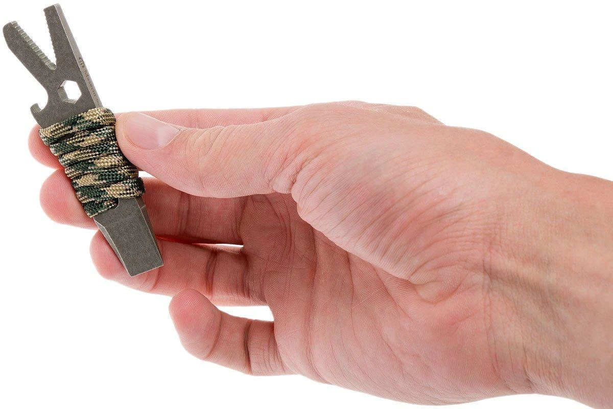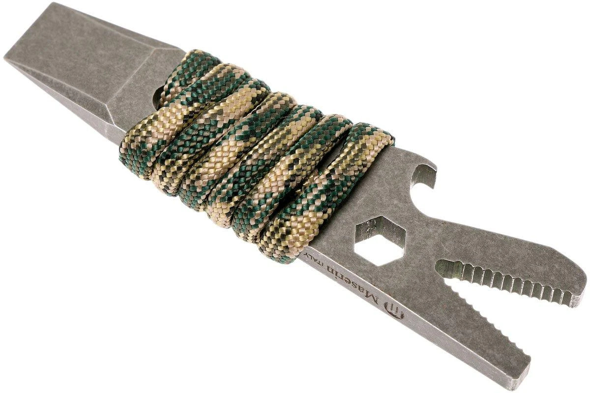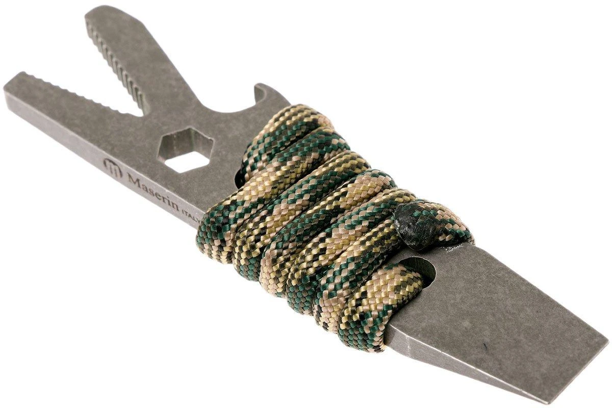Le 905/F tool est un multitool conçu par Maserin, pratique pour diverses tâches. L’outil est assez petit et pèse à peine 41 grammes, paracorde incluse. Parfait pour mettre sur un trousseau de clés ou dans sa poche de pantalon ! Avec une longueur de 8,5 cm, on a assez d’adhérence pour y exercer de la force au besoin.