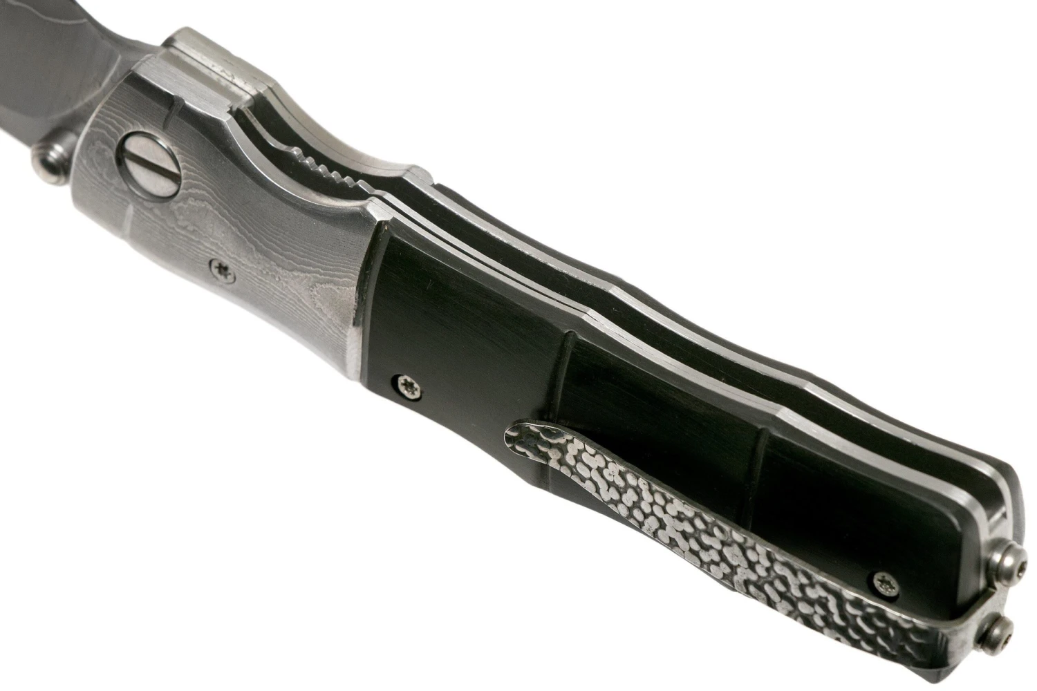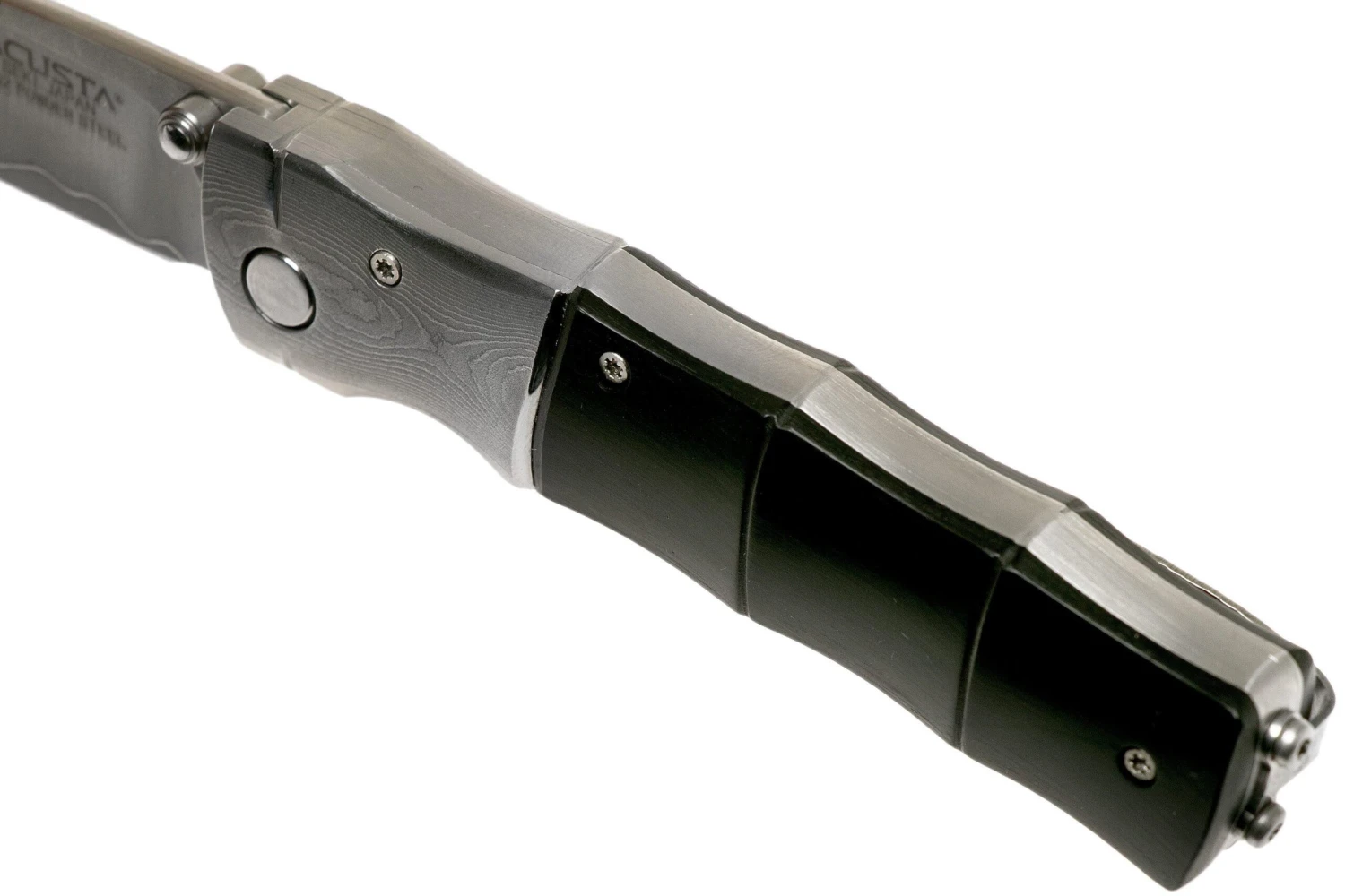 Le Mcusta MC-145G Shinra Mixture Bamboo black pakkawood est un couteau de gentleman très Ă©lĂ©gant, fabriquĂ© au Japon. Le manche de ce couteau est en superbe bois pakka noir. Le bois est dotĂ© d’une superbe texture de type bambou. On a donc la sensation d’avoir un manche fabriquĂ© Ă partir d’un vrai morceau de bambou. Non seulement c’est magnifique mais cela ajoute Ă©galement une bonne adhĂ©rence. Le tout est agrĂ©mentĂ© de superbes mitres en acier damas. La transition entre le bois et les mitres en acier est tout simplement sublime. Au toucher, on sent Ă peine la transition entre les deux matĂ©riaux. Le dos de la lame est arrondi et le pivot fonctionne de façon très fluide. Un solide linerlock maintient la lame en position ouverte.