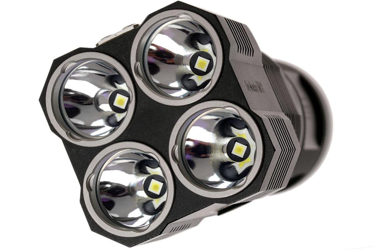 La NiteCore TM28 QuadRay Tiny Monster est une lampe incroyablement puissante. La TM28 est une lampe de poche très compacte avec des fonctions intelligentes. Ce n’est pas pour rien qu’elle s’appelle Tiny Monster (petit monstre). Les quatre têtes de lampes intégrées sont chacune dotées d’une LED Cree XHP35. Ensemble elles produisent un faisceau lumineux allant jusqu’à 6000 lumen ANSI. Une incroyable intensité lumineuse, plus puissante que deux phares de voiture.