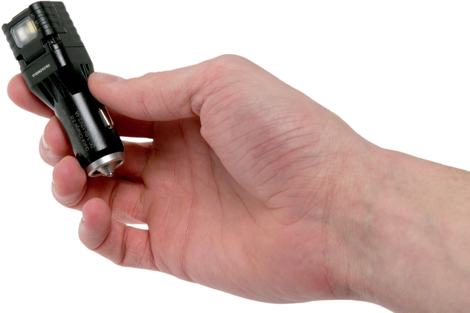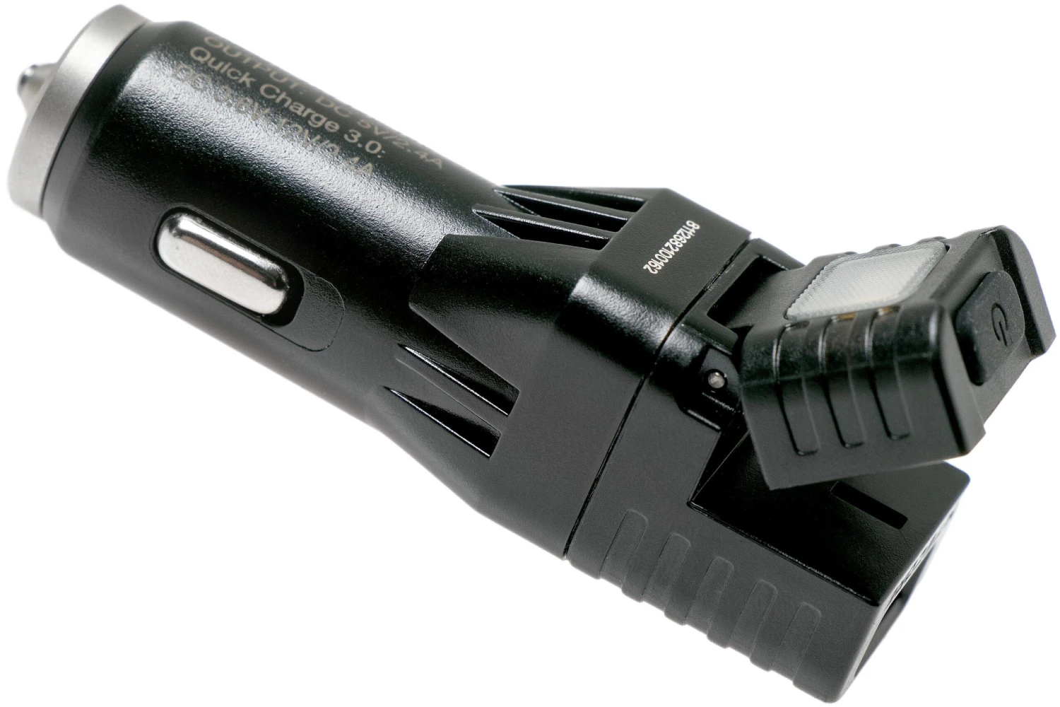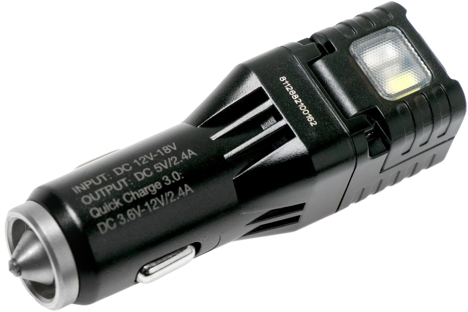 Le NiteCore VCL10 est un chargeur voiture innovant et multifonction. Ce chargeur prend en charge les USB Quick Charge 2.0 et 3.0 et les reconnait automatiquement. En plus de charger vos appareils, ce chargeur a trois fonctions supplémentaires : brise vitre, lampe de poche et lumière rouge. Le boîtier magnétique vous permet de la placer facilement sur tous supports métalliques. Par exemple sur la carrosserie de votre voiture. Parfait pour vous éclairer lorsque vous devez changer votre pneu. La tête de la lampe pouvant pivoter à 90 degrés, la lampe (jusqu’à 25 lumen) brille toujours là où vous voulez. La lampe a une autonomie de 3 heures en lumière blanche et 20 heures en lumière rouge lorsqu’elle est complètement chargée. Cette lampe peut également détecter les autres véhicules. Le voyant rouge clignote lorsque la lampe détecte un véhicule venant en sens inverse. Cette lampe peut également servir en cas d’urgence grâce au brise vitre.