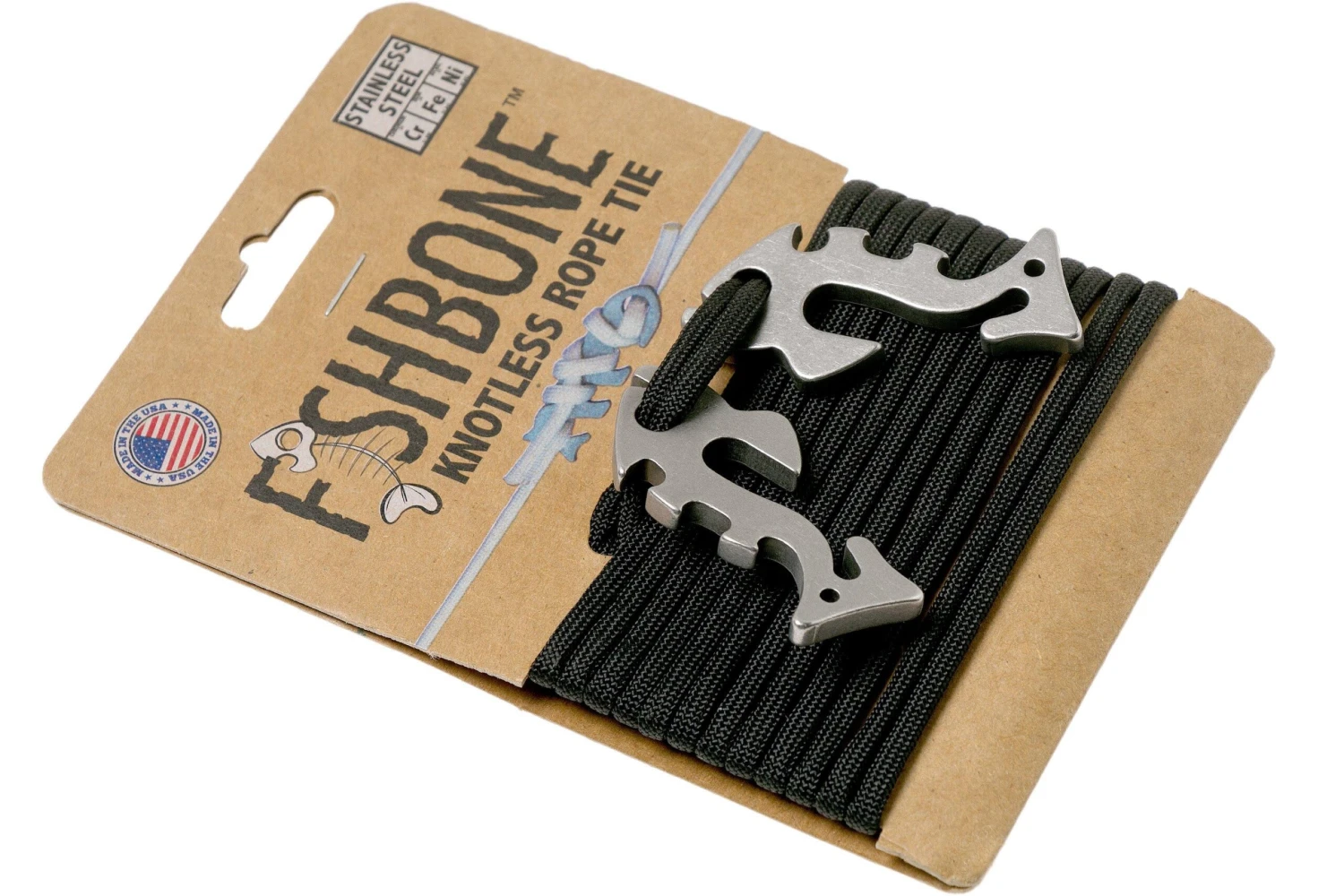 Ce Piranha (également nommé Fish Bone 2.0) est un outil pratique avec lequel on peut accrocher de la paracorde dont l’épaisseur est de 4 mm max. sans avoir à faire de nœud. Le principe de base reste le même : on place l’extrémité de la paracorde autour du Piranha et on tire vers l’arrière. La friction entre les cordes la maintient en place. L’autre bout fait deux fois le tour de la tête pour un deuxième ancrage solide. Un Piranha est un peu plus épais et plus costaud qu’un Fish Bone.