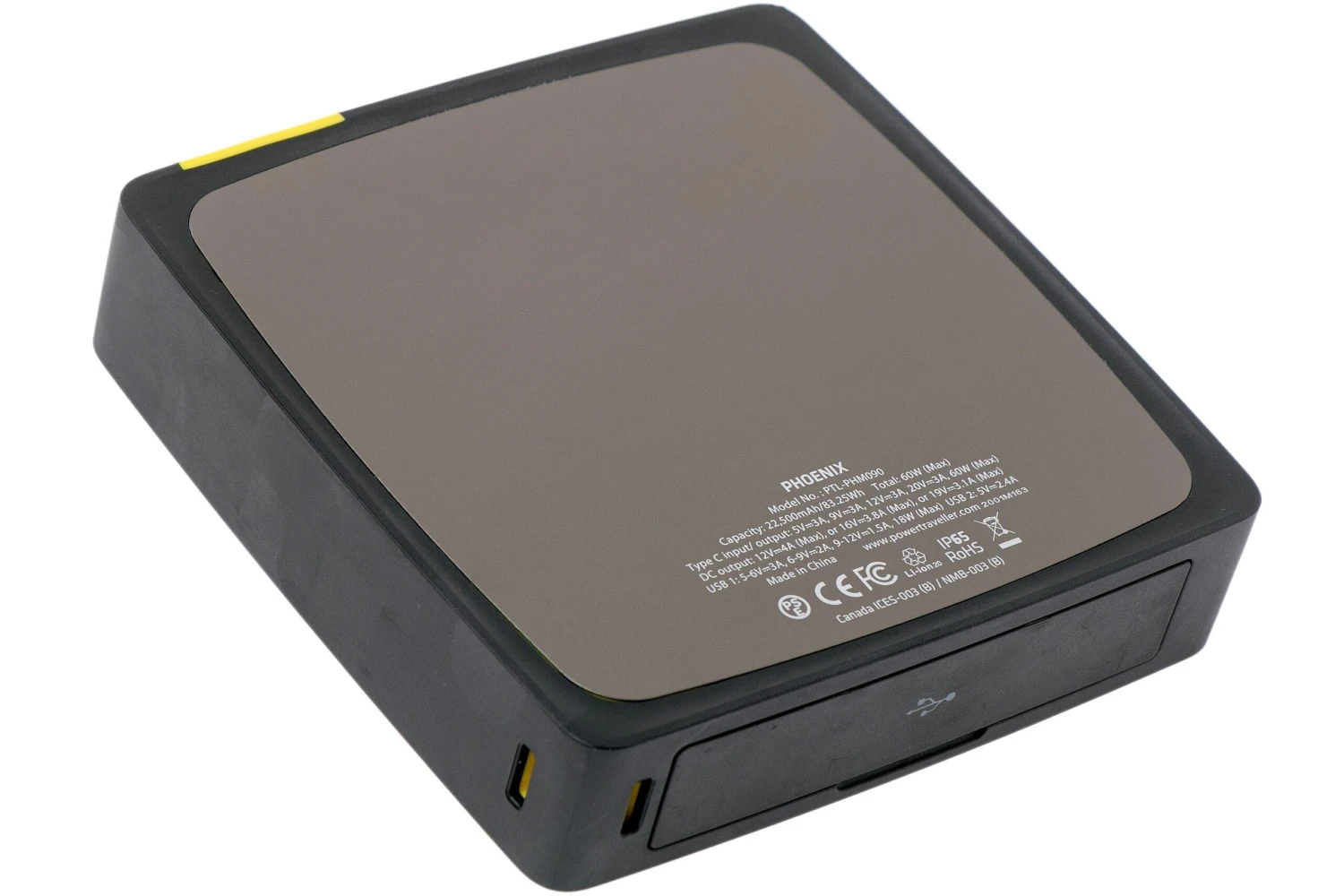 Le Power Pack Powertraveller PHOENIX 90 est une powerbank puissante de 83,3 Wh (22500mAh) avec laquelle recharger super vite et facilement tous vos appareils 5v – 20v. La powerbank convient aux appareils 5V (USB), 5 – 20V (60W PD) et 12 – 16 – 19V PD. La PHOENIX 90 se recharge en 3 heures via prise de courant ou panneau solaire USB. Avec un adaptateur USB, on peut aussi la recharger via l’allume-cigare de sa voiture. L’écran LCD indique la quantité d’énergie restante de la batterie interne.