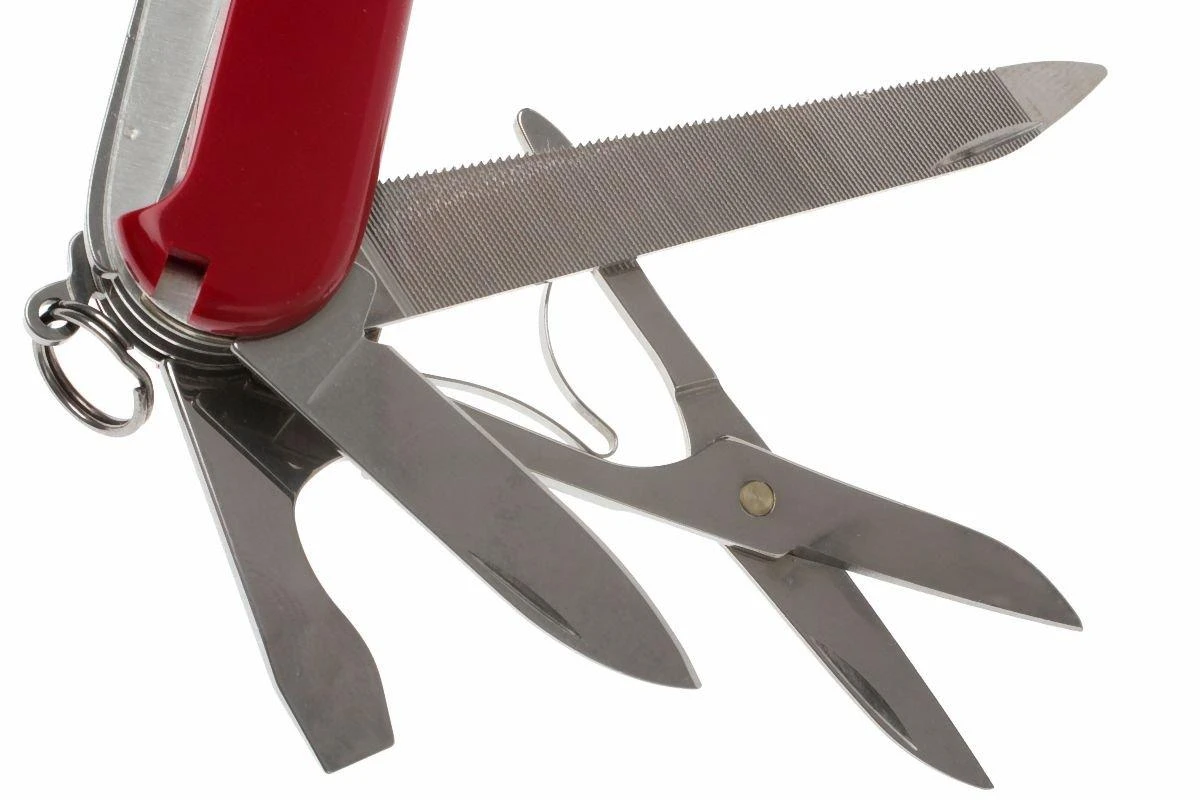 Des couteaux suisses haut de gamme au manche rouge brillant.