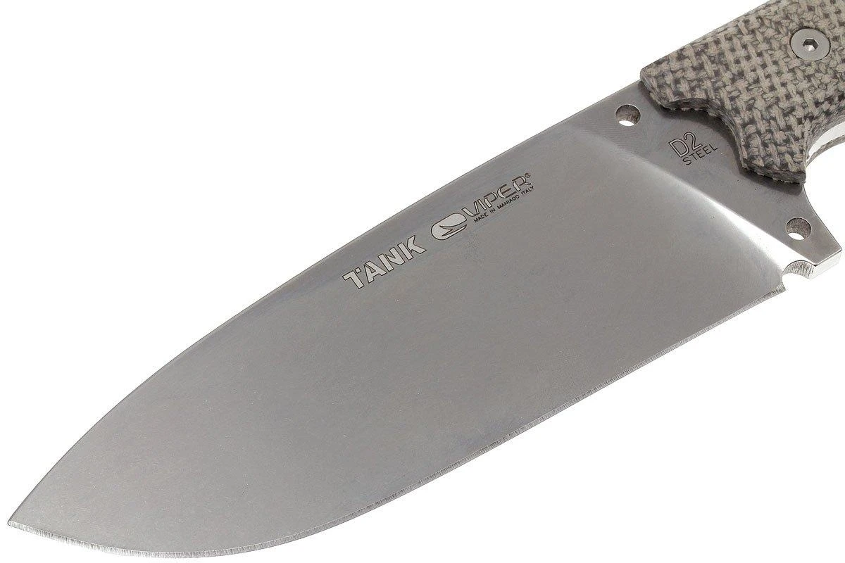 Le Viper Tank est un animal à lame fixe à l’aspect animal. Le couteau est conçu comme un couteau polyvalent pour les militaires. Parce qu’aujourd’hui un couteau n’est pas tant utilisé à des fins de combat dans un contexte militaire, ce couteau est plus conçu comme un couteau utilitaire polyvalent. Dans cette conception, le manche est courbé vers le bas. Cela vous donne une prise confortable sur le manche pendant les travaux d’abattage. La grande empreinte pour le doigt derrière le manche vous donne un peu plus de prise et de contrôle sur la lame, même lorsque vous travaillez avec plus de précision.