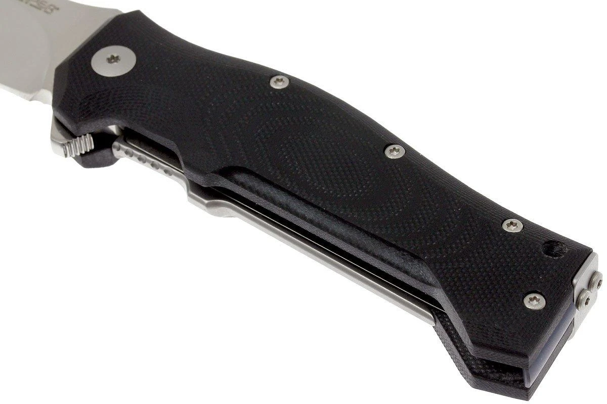 Le Viper Ten est un couteau de poche italien élégant, avec un flipper. La lame en acier N690Co est très bien finie. Le dos arrondi et le liseré rendent les lignes de ce couteau très sexy. Le manche est en G10 noir. Pour gagner encore plus de poids, il n’y a pas de liner en acier, mais le matériau du manche fait office de liner. Pour donner au couteau son linerlock solide, le manche côté fermeture est équipé d’un insert en acier sur lequel est fixée la barre de verrouillage.