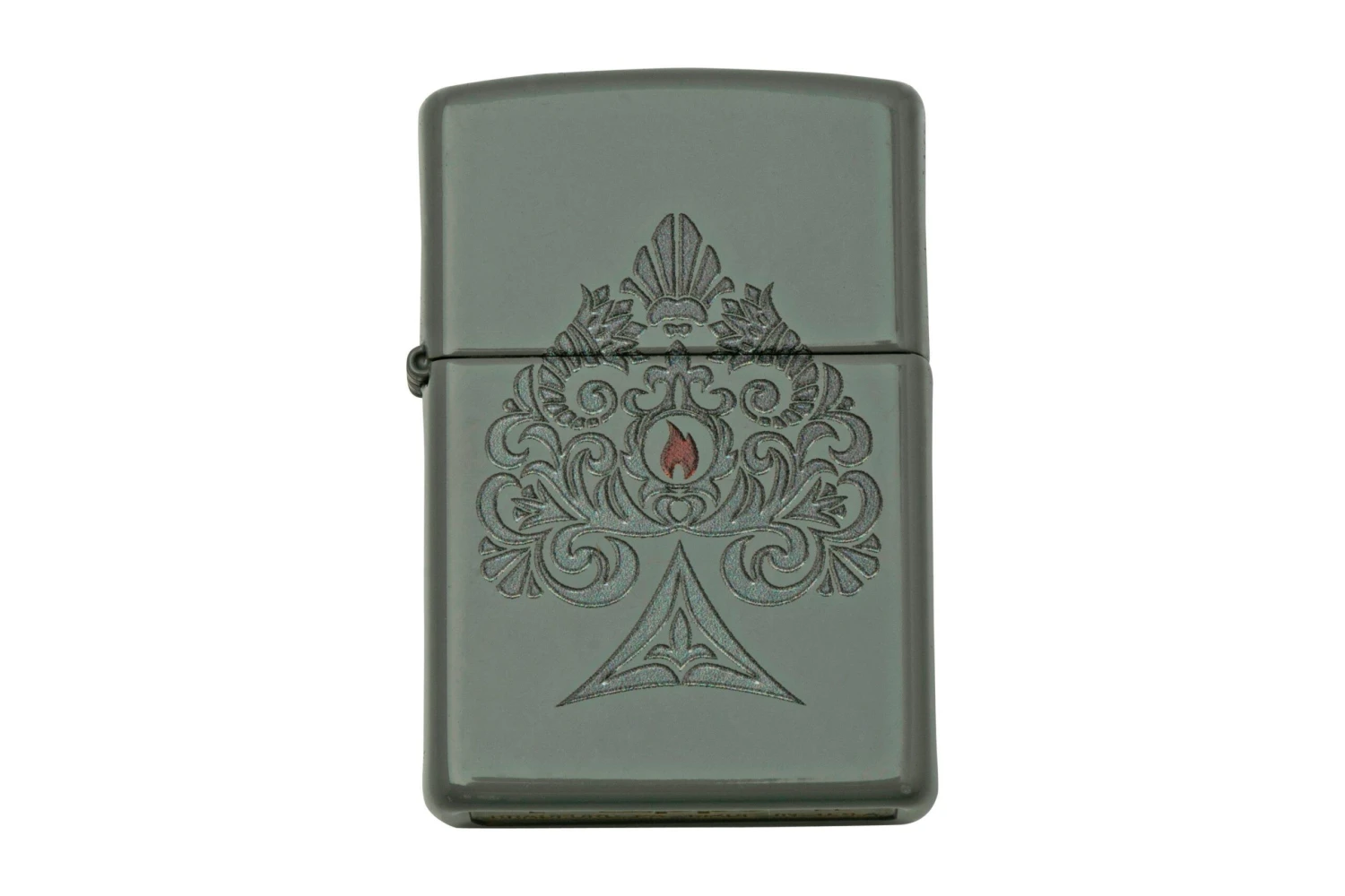 Ce briquet Zippo est noir mat, avec un motif complexe gravé au laser.